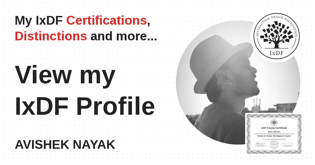 IxDF Course Certificates are awarded to AVISHEK NAYAK in formal recognition of their coursework surpassing the rigorous benchmarks of exceptional performance established by the IxDF Educational Codex.