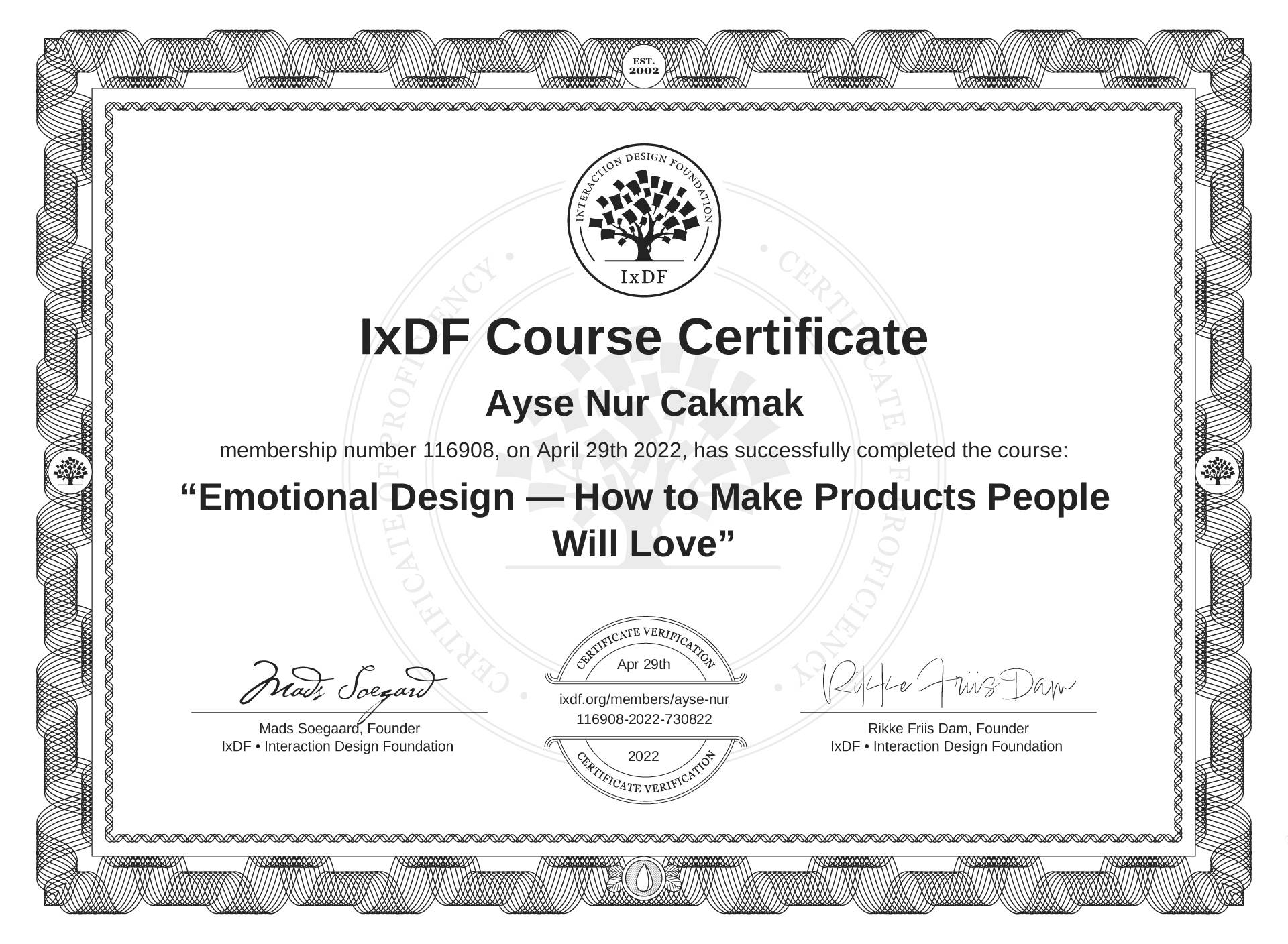 IxDF Course Certificate awarded to Ayşe Nur Çakmak for completing the "Emotional Design — How to Make Products People Will Love" course