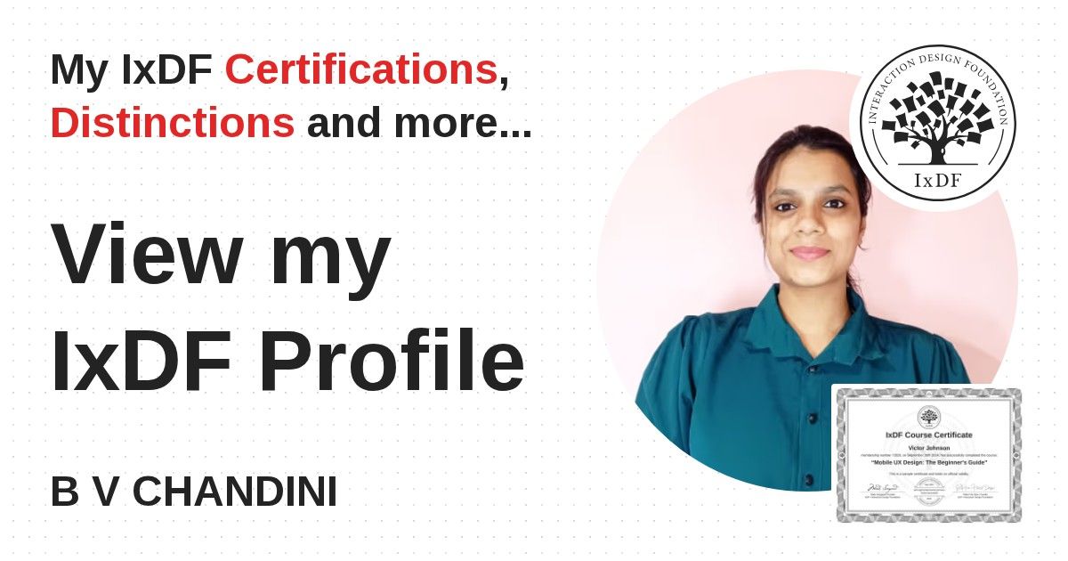 IxDF Course Certificates are awarded to B V CHANDINI in formal recognition of their coursework surpassing the rigorous benchmarks of exceptional performance established by the IxDF Educational Codex.