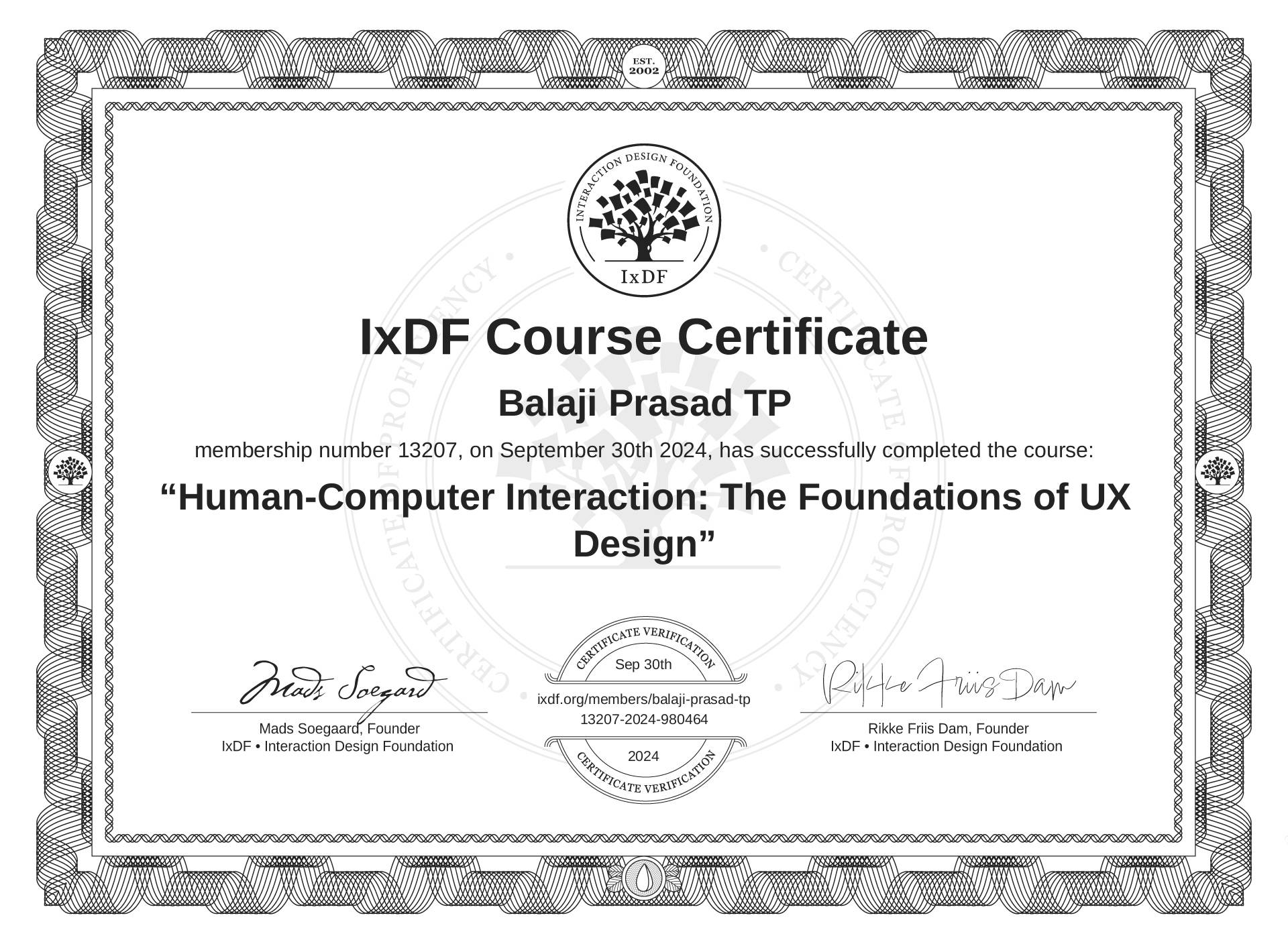 IxDF Course Certificate awarded to Balaji Prasad TP for completing the "Human-Computer Interaction: The Foundations of UX Design" course