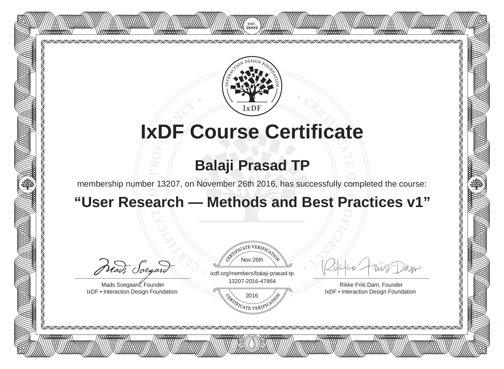 The IxDF Course Certificate (ID #MJzx0z7m7) above is awarded to Balaji Prasad TP in formal recognition of their coursework surpassing the rigorous benchmarks of exceptional performance established by the IxDF Educational Codex. View Course Curriculum.