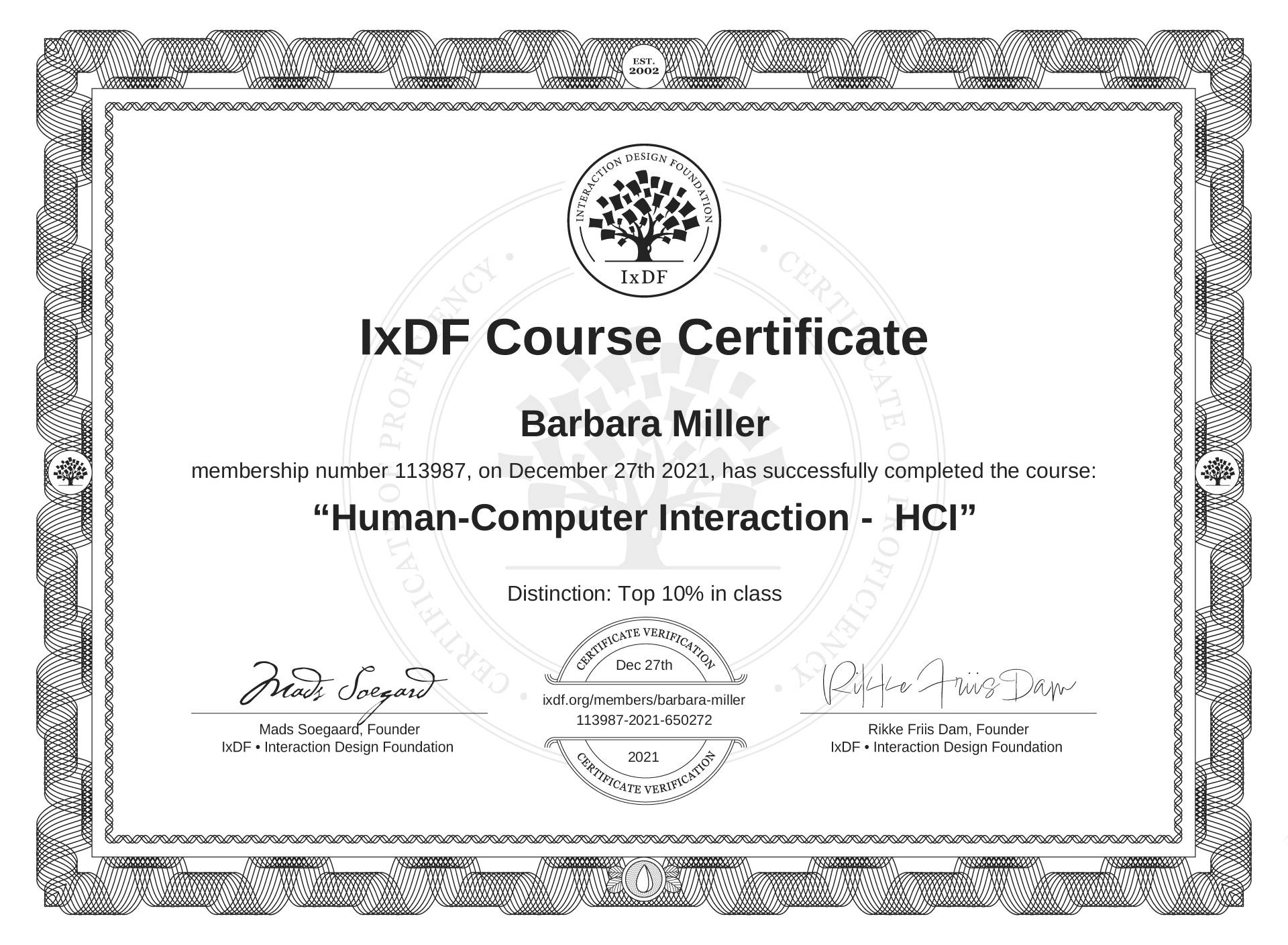 The IxDF Course Certificate (ID #f9cadb4c-596e-48aa-97fc-0ce1536370a7) above is awarded to Barbara Miller