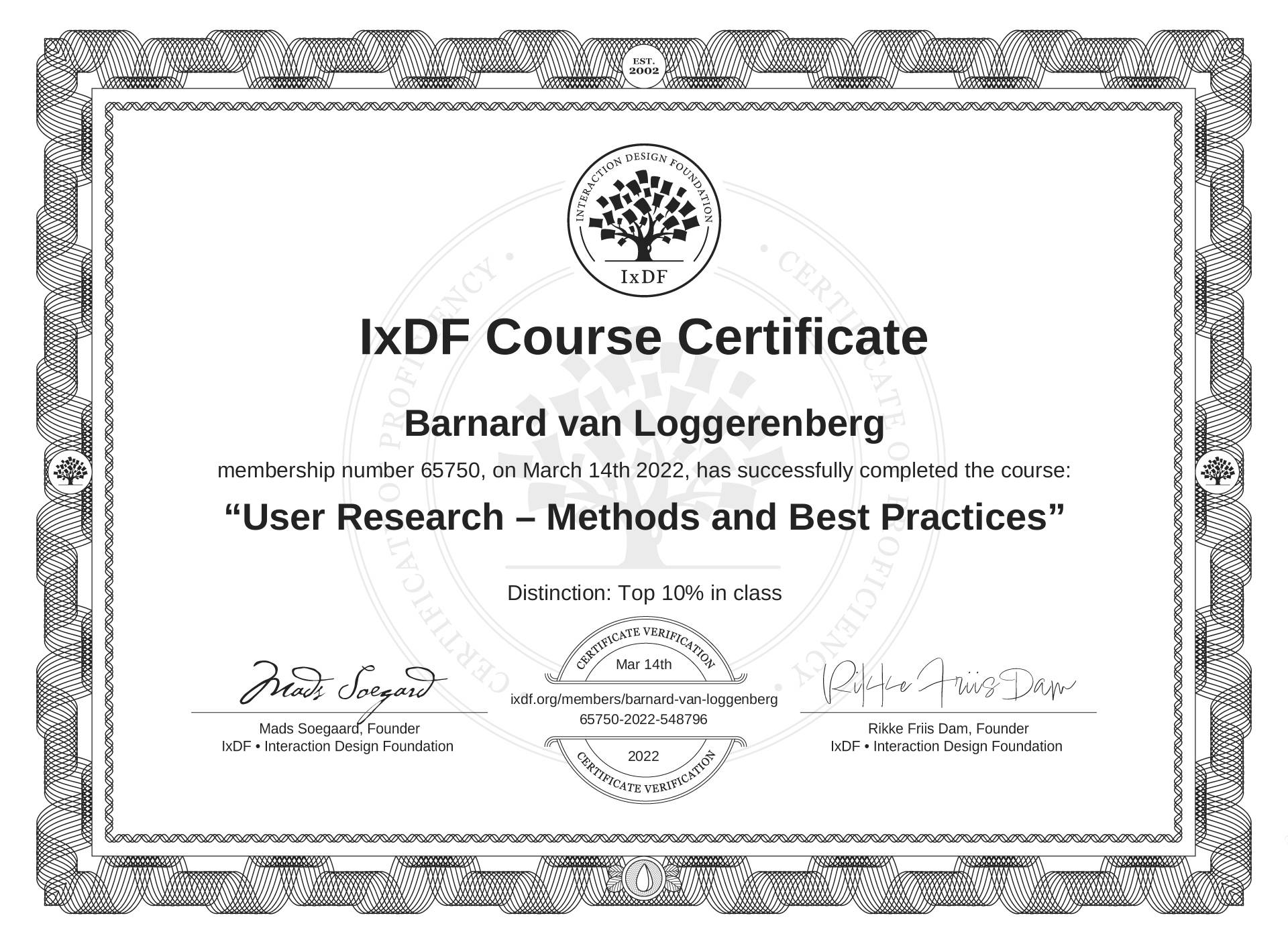 The IxDF Course Certificate (ID #0b8df56d-c3ac-4b51-bb01-04187a5d1e8c) above is awarded to Barnard van Loggerenberg