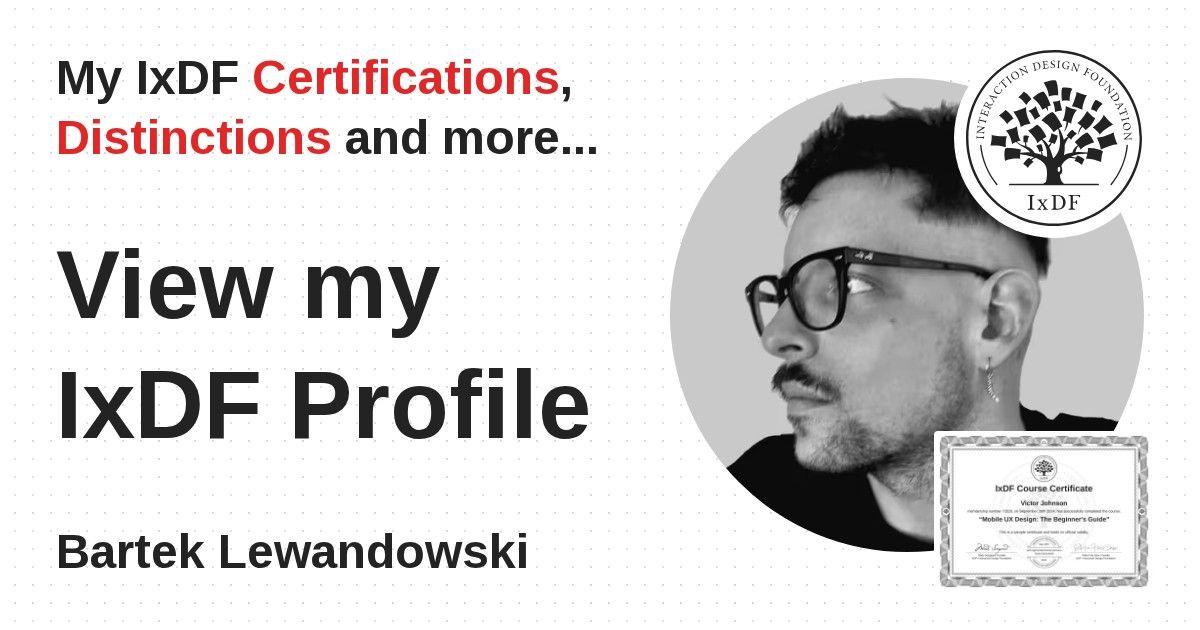 IxDF Course Certificates are awarded to Bartek Lewandowski in formal recognition of their coursework surpassing the rigorous benchmarks of exceptional performance established by the IxDF Educational Codex.