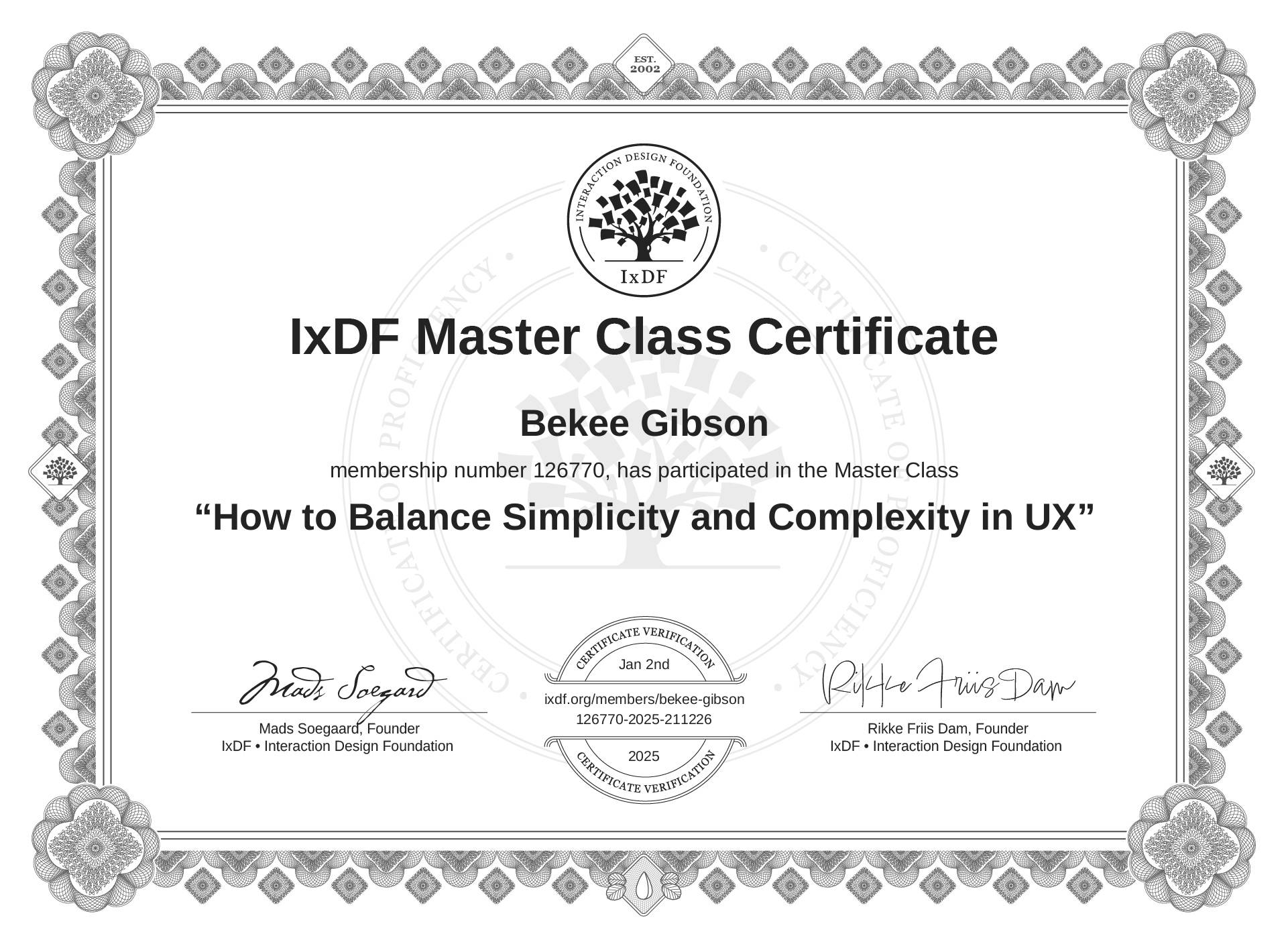 Bekee Gibson's Masterclass Certificate: How to Balance Simplicity and Complexity in UX