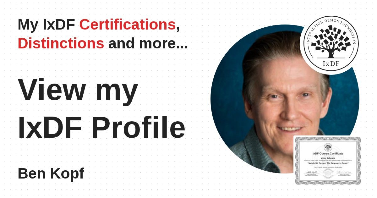 IxDF Course Certificates are awarded to Ben Kopf in formal recognition of their coursework surpassing the rigorous benchmarks of exceptional performance established by the IxDF Educational Codex.