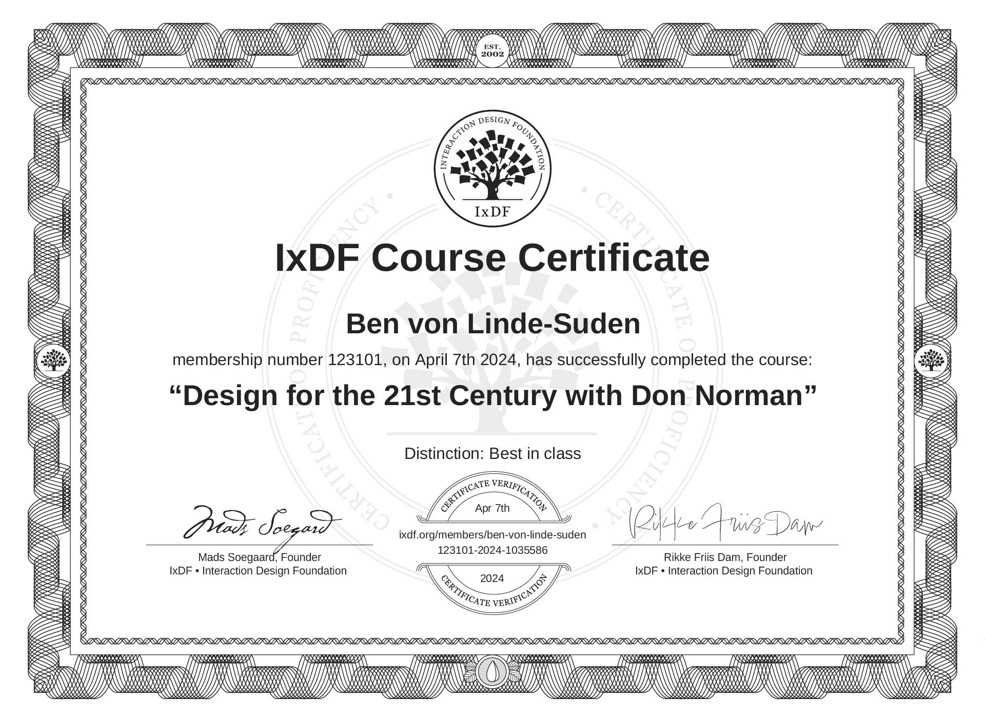 This IxDF Membership Certificate is issued to Ben von Linde-Suden