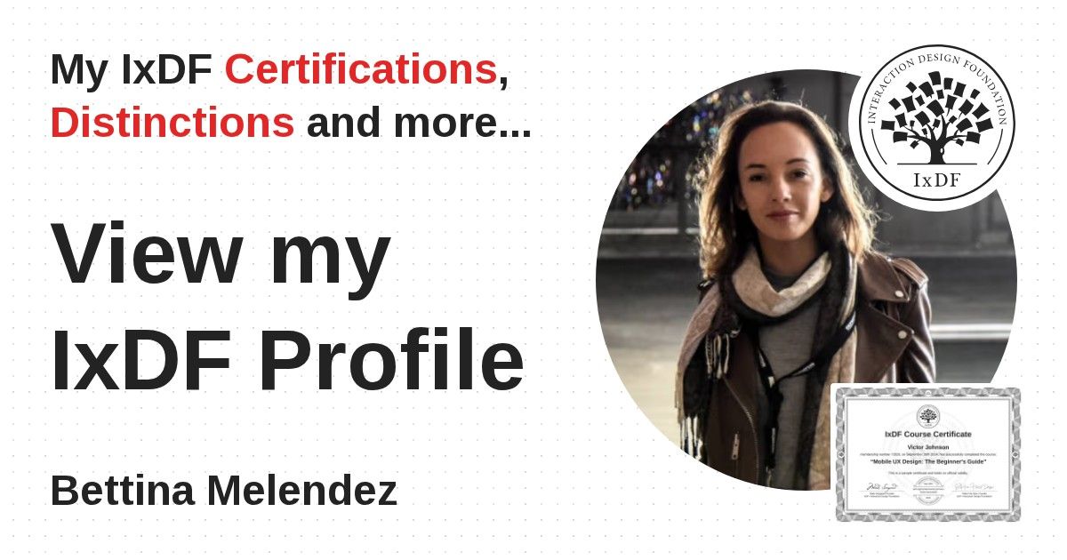 IxDF Course Certificates are awarded to Bettina Melendez in formal recognition of their coursework surpassing the rigorous benchmarks of exceptional performance established by the IxDF Educational Codex.