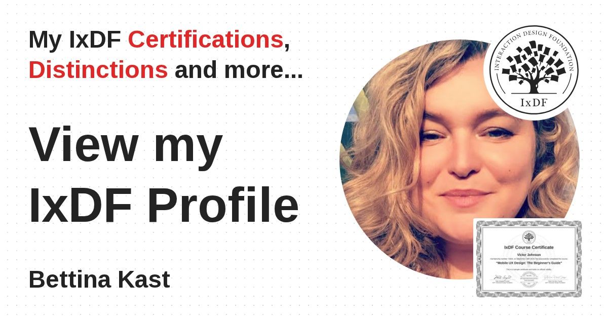 IxDF Course Certificates are awarded to Bettina Kast in formal recognition of their coursework surpassing the rigorous benchmarks of exceptional performance established by the IxDF Educational Codex.