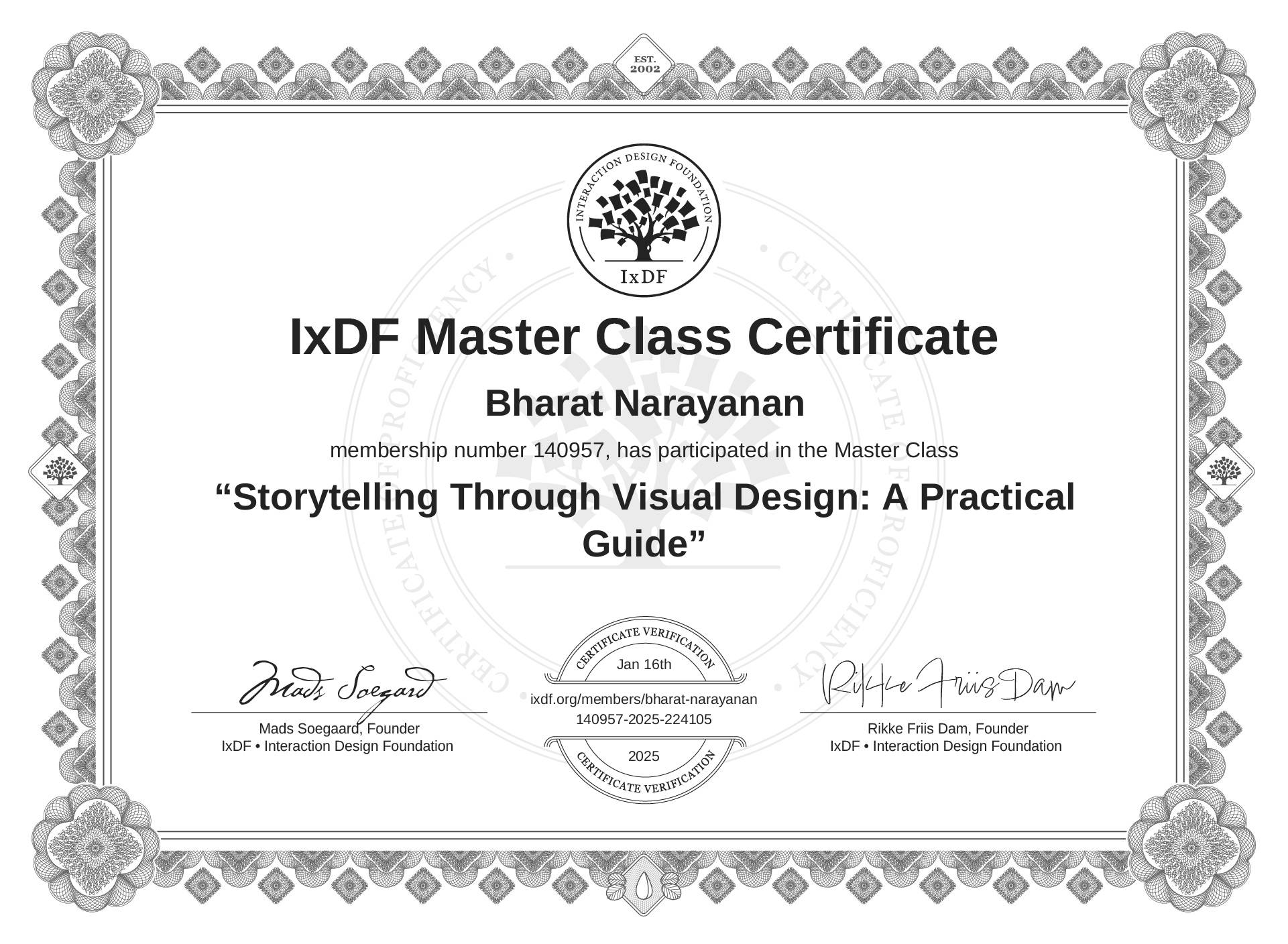 The IxDF Master Class Certificate (ID #mcc_dda42b4e20c541d3a92d481a7989b37f) above is awarded to Bharat Narayanan in formal recognition of their participation in the Master Class Storytelling Through Visual Design: A Practical Guide .