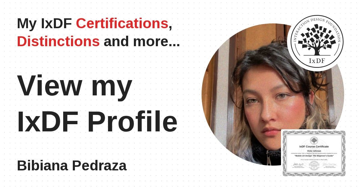 IxDF Course Certificates are awarded to Bibiana Pedraza in formal recognition of their coursework surpassing the rigorous benchmarks of exceptional performance established by the IxDF Educational Codex.