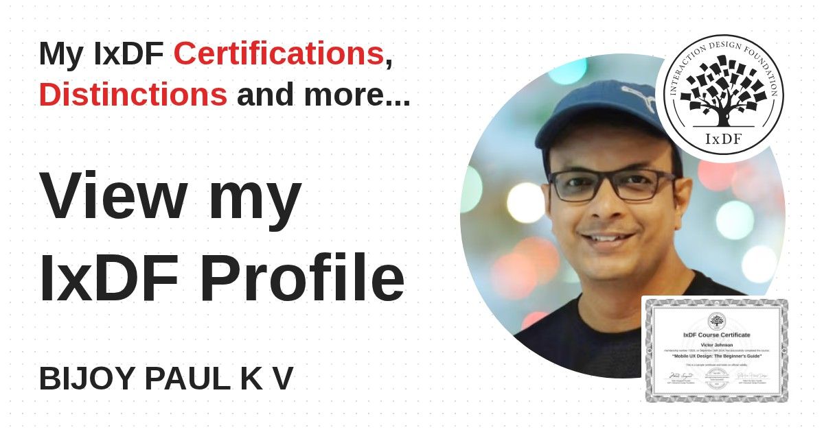 IxDF Course Certificates are awarded to BIJOY PAUL K V in formal recognition of their coursework surpassing the rigorous benchmarks of exceptional performance established by the IxDF Educational Codex.