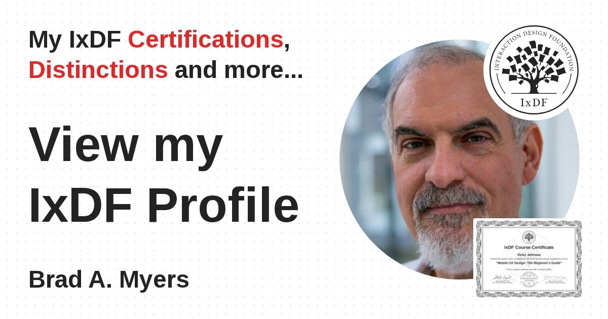 This IxDF Membership Certificate is issued to Brad A. Myers in formal recognition of their membership of the IxDF, global leader in design education.