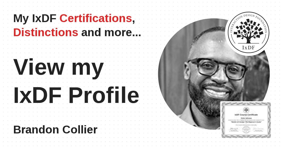 IxDF Course Certificates are awarded to Brandon Collier in formal recognition of their coursework surpassing the rigorous benchmarks of exceptional performance established by the IxDF Educational Codex.