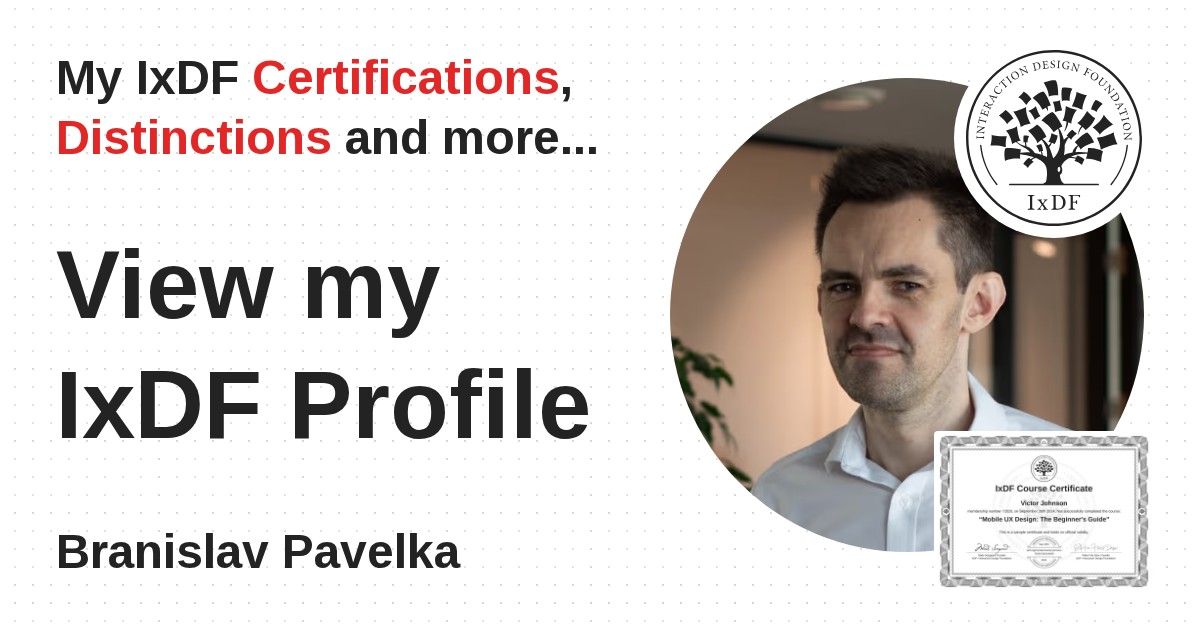 IxDF Course Certificates are awarded to Branislav Pavelka in formal recognition of their coursework surpassing the rigorous benchmarks of exceptional performance established by the IxDF Educational Codex.
