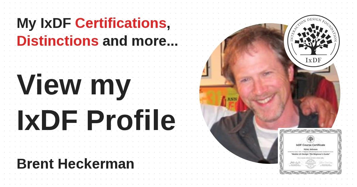 IxDF Course Certificates are awarded to Brent Heckerman in formal recognition of their coursework surpassing the rigorous benchmarks of exceptional performance established by the IxDF Educational Codex.