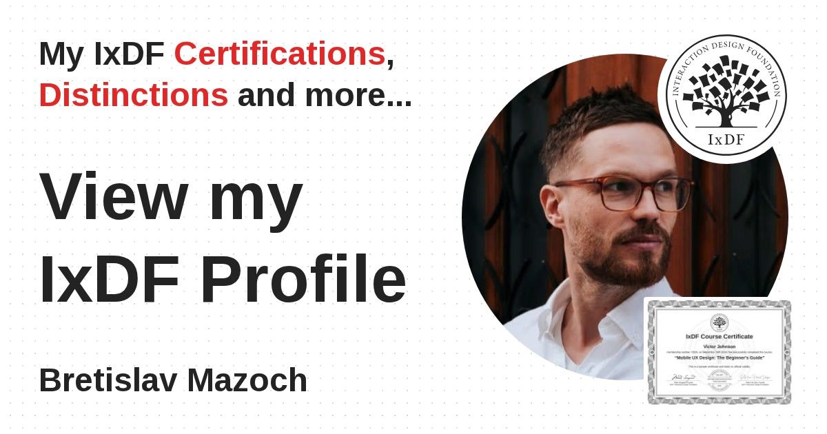 IxDF Course Certificates are awarded to Bretislav Mazoch in formal recognition of their coursework surpassing the rigorous benchmarks of exceptional performance established by the IxDF Educational Codex.