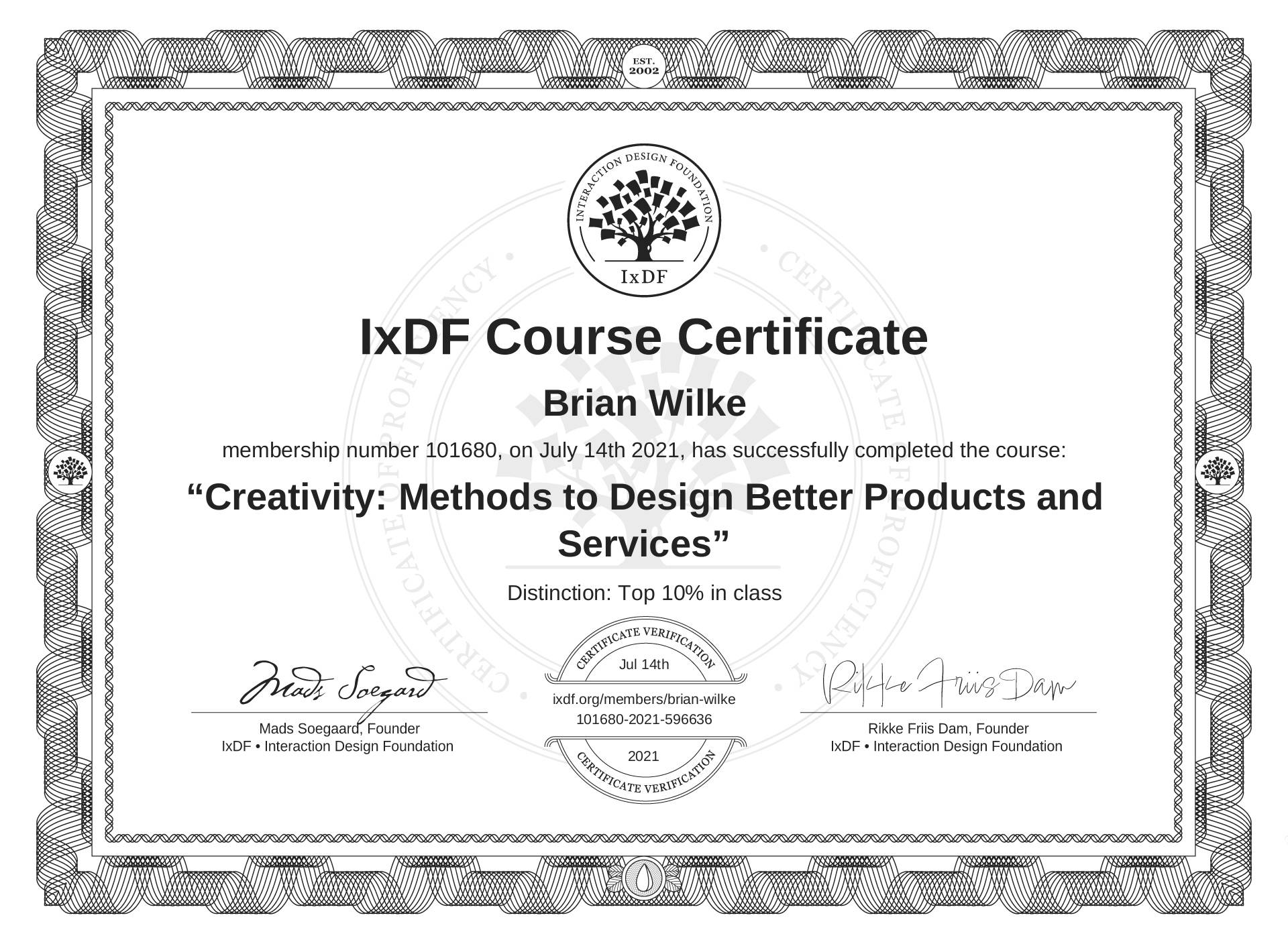 IxDF Course Certificates are awarded to Brian Wilke in formal recognition of their coursework surpassing the rigorous benchmarks of exceptional performance established by the IxDF Educational Codex.