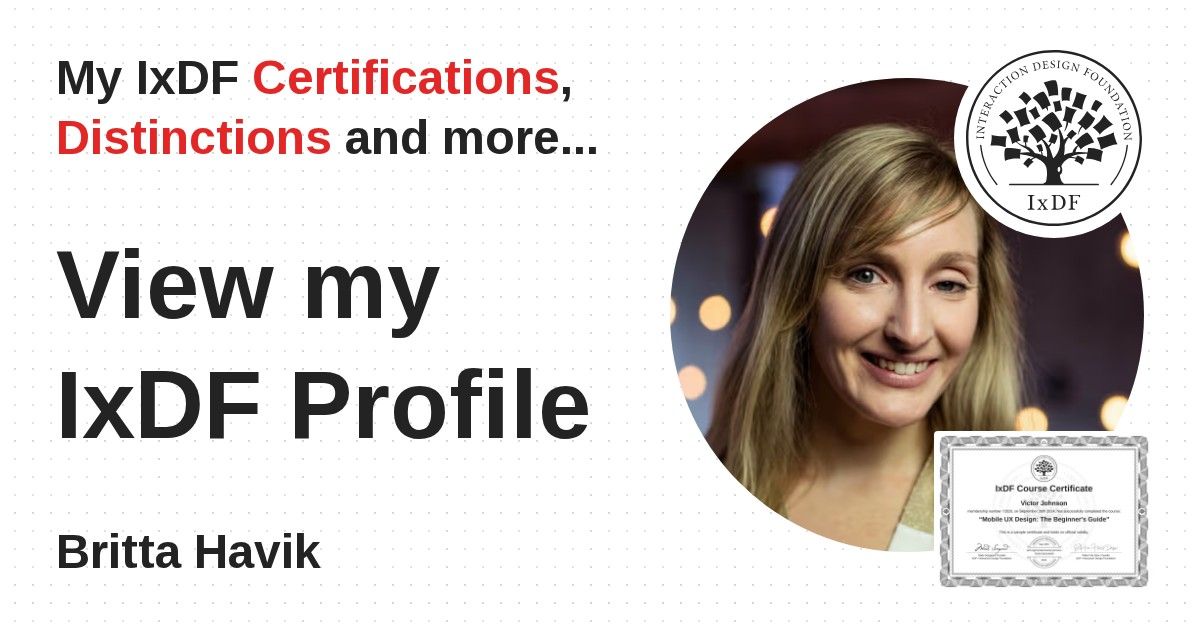 IxDF Course Certificates are awarded to Britta Havik in formal recognition of their coursework surpassing the rigorous benchmarks of exceptional performance established by the IxDF Educational Codex.