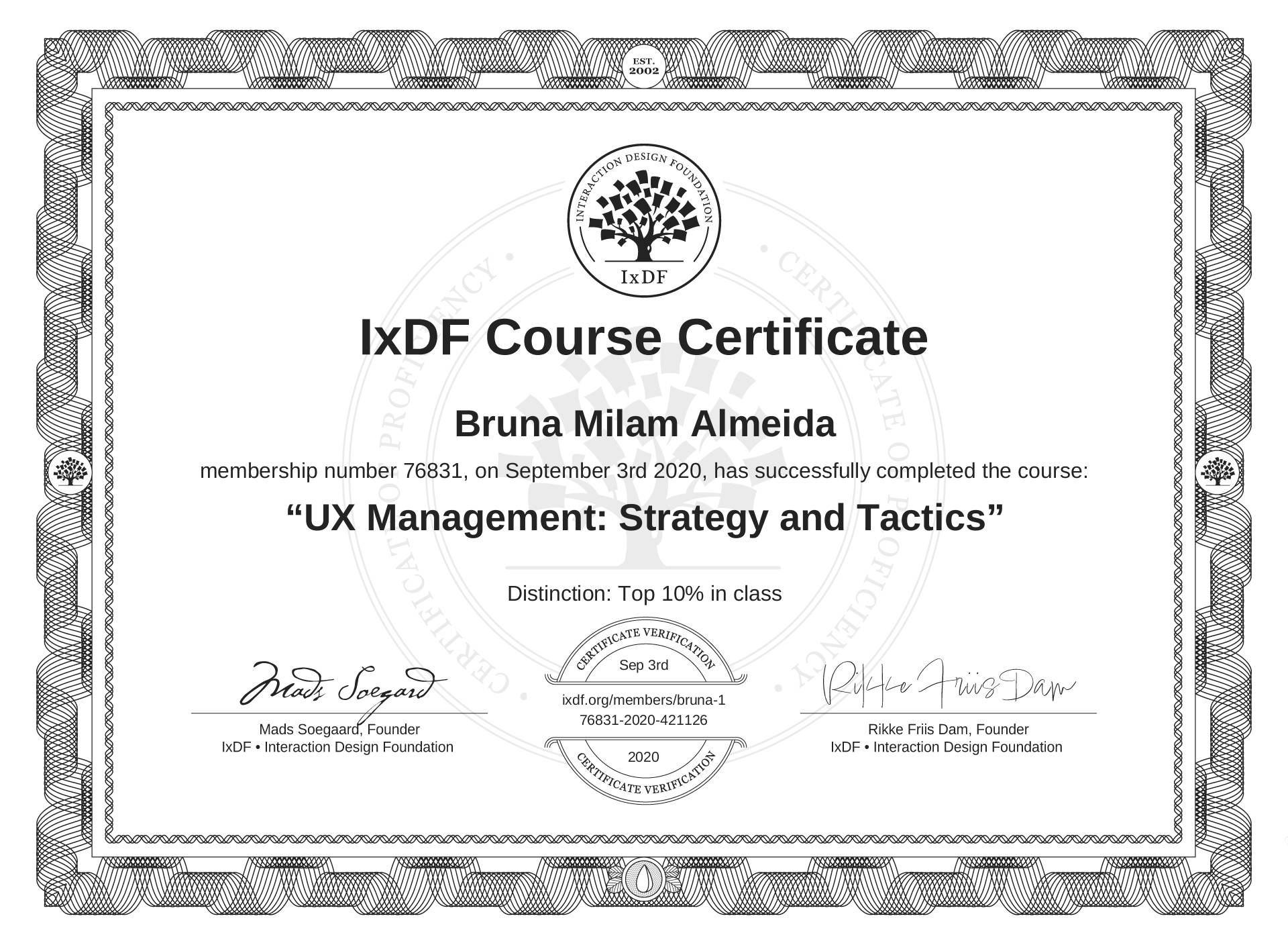 This IxDF Membership Certificate is issued to Bruna Milam Almeida