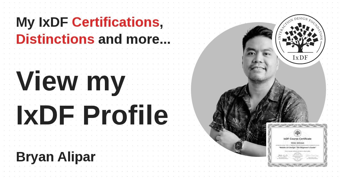 IxDF Course Certificates are awarded to Bryan Alipar in formal recognition of their coursework surpassing the rigorous benchmarks of exceptional performance established by the IxDF Educational Codex.