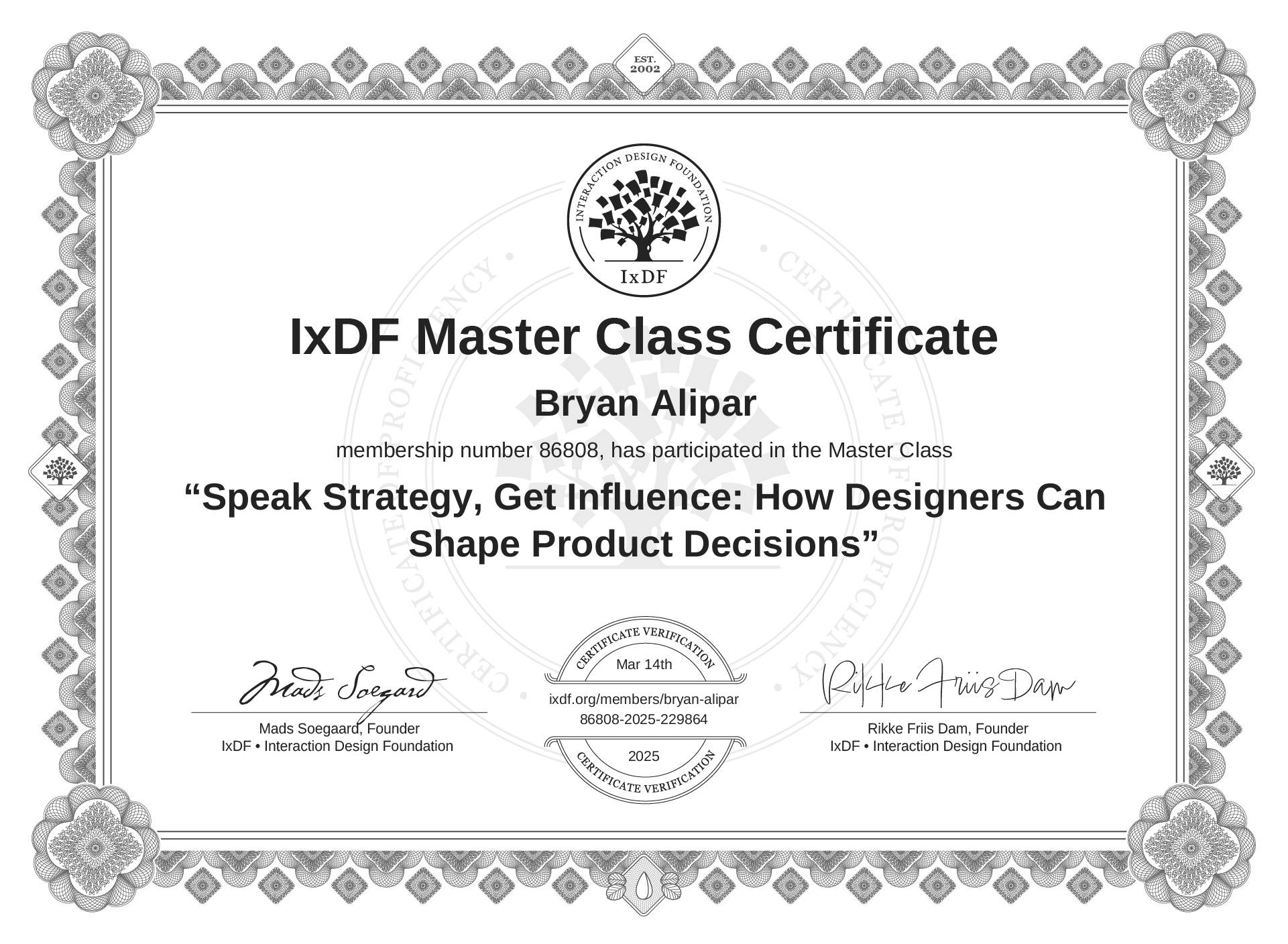 IxDF Master Class Certificates are awarded to Bryan Alipar in formal recognition of their attendance and ongoing commitment to learning from industry leaders.