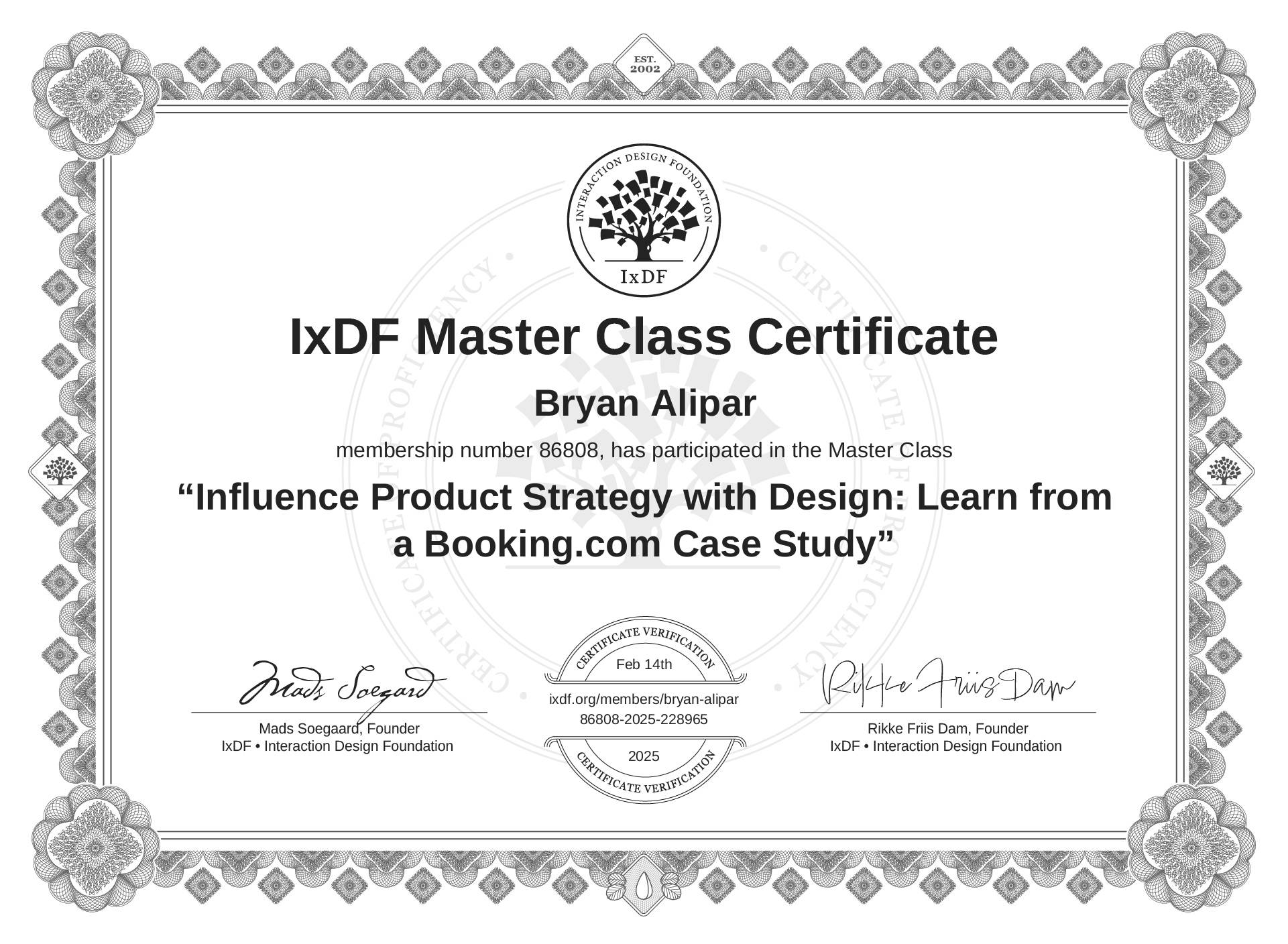 IxDF Master Class Certificate awarded to Bryan Alipar for attending the "Influence Product Strategy with Design: Learn from a Booking.com Case Study" Master Class