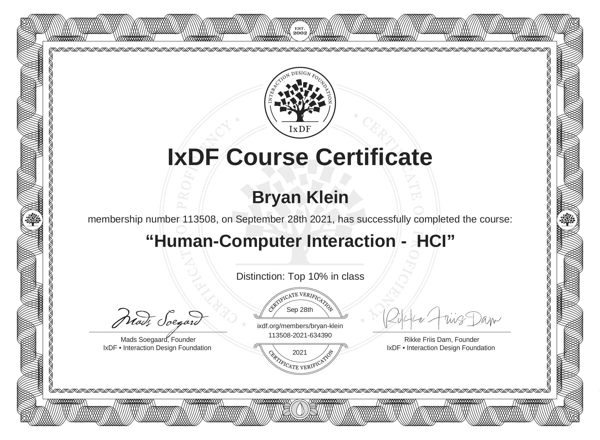 The IxDF Course Certificate (ID #e3186252-4c10-4fd7-b101-26deb1cc50b5) above is awarded to Bryan Klein