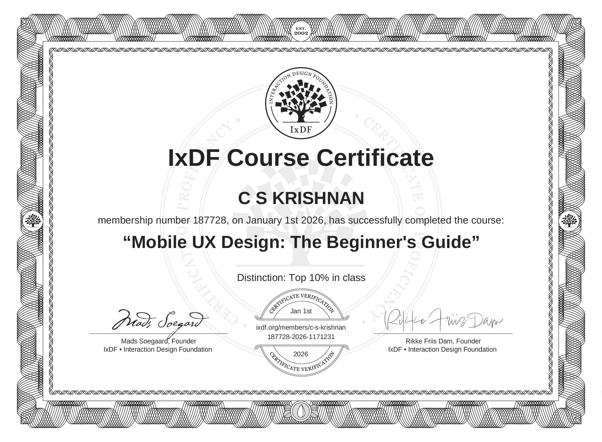 The IxDF Course Certificate (ID #78033365-7ff6-49eb-a449-a022d0964261) above is awarded to C S KRISHNAN