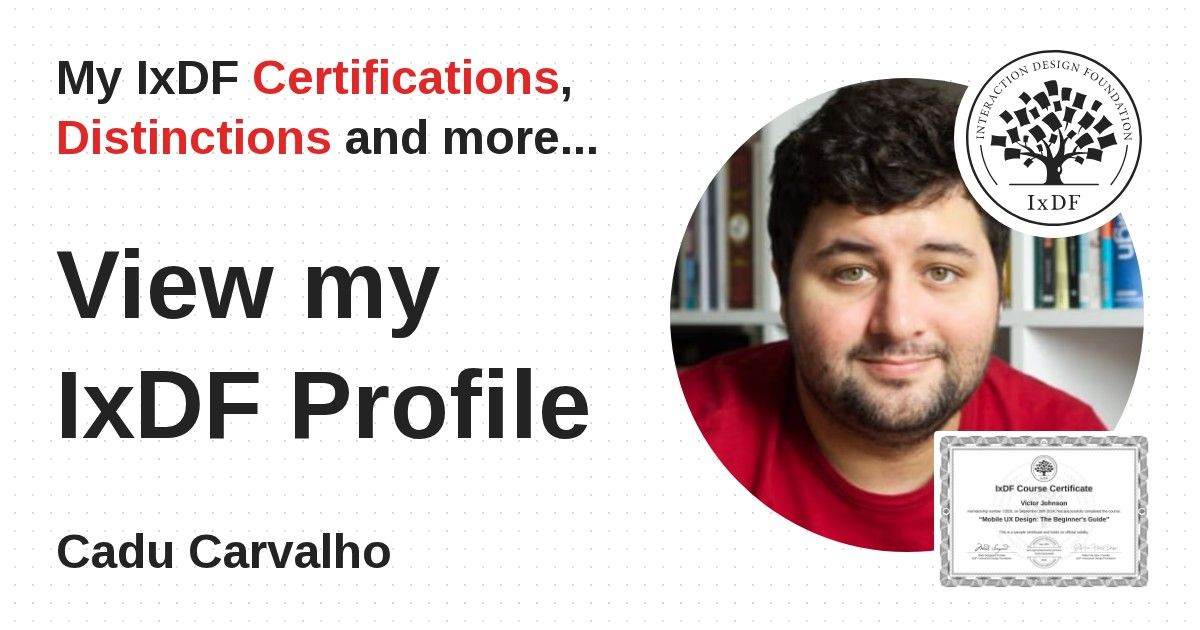 IxDF Course Certificates are awarded to Cadu Carvalho in formal recognition of their coursework surpassing the rigorous benchmarks of exceptional performance established by the IxDF Educational Codex.