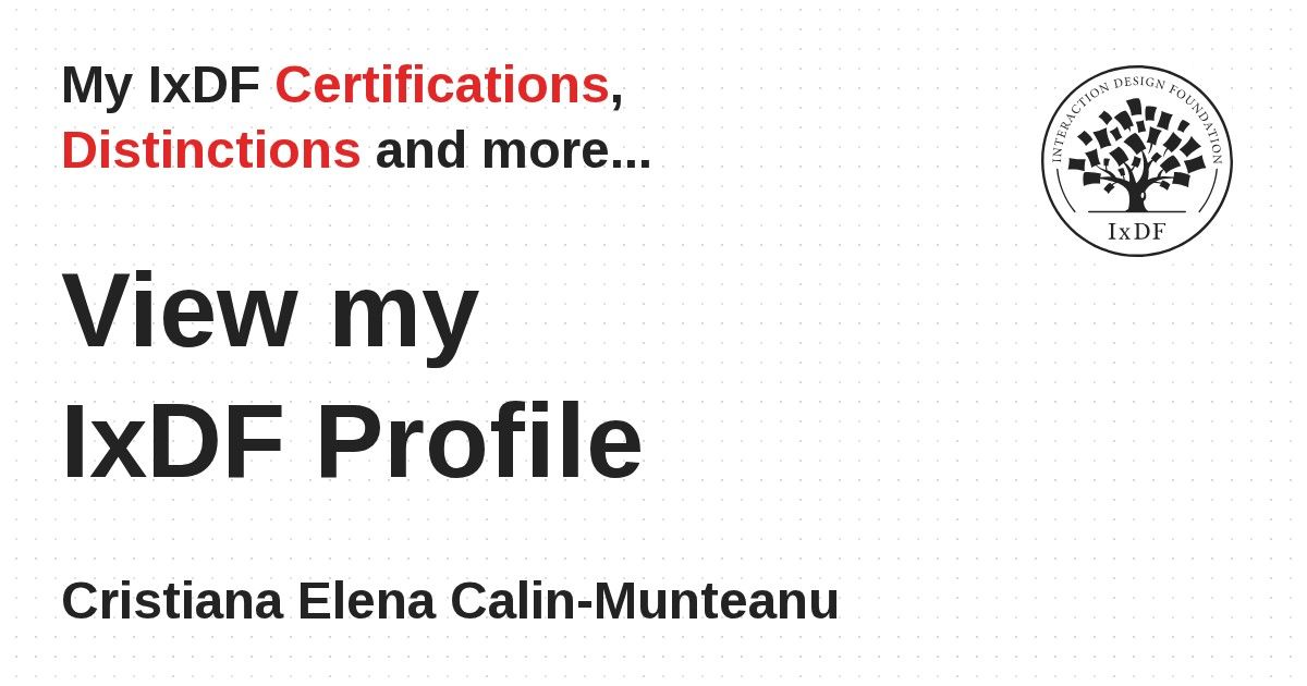 IxDF Course Certificates are awarded to Cristiana Elena Calin-Munteanu in formal recognition of their coursework surpassing the rigorous benchmarks of exceptional performance established by the IxDF Educational Codex.