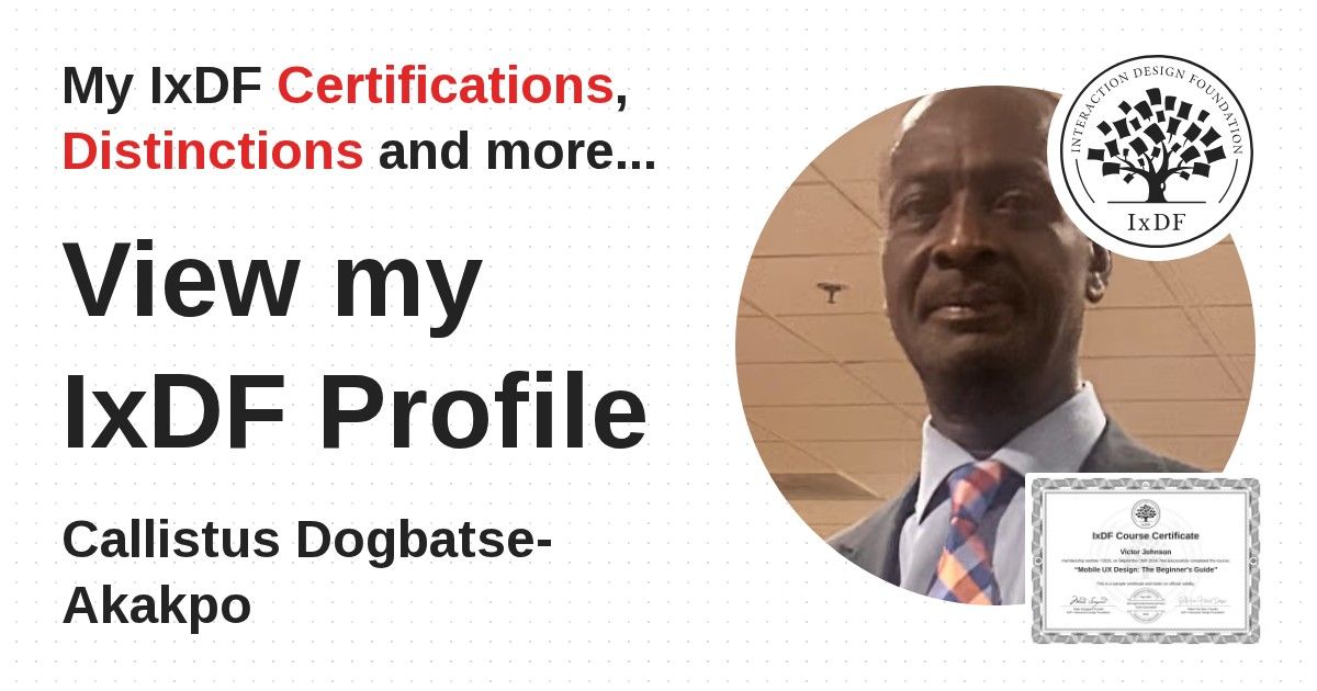 IxDF Course Certificates are awarded to Callistus Dogbatse-Akakpo in formal recognition of their coursework surpassing the rigorous benchmarks of exceptional performance established by the IxDF Educational Codex.