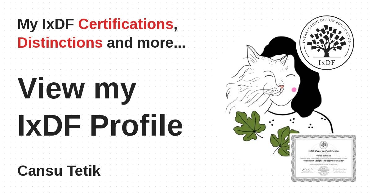 IxDF Course Certificates are awarded to Cansu Tetik in formal recognition of their coursework surpassing the rigorous benchmarks of exceptional performance established by the IxDF Educational Codex.