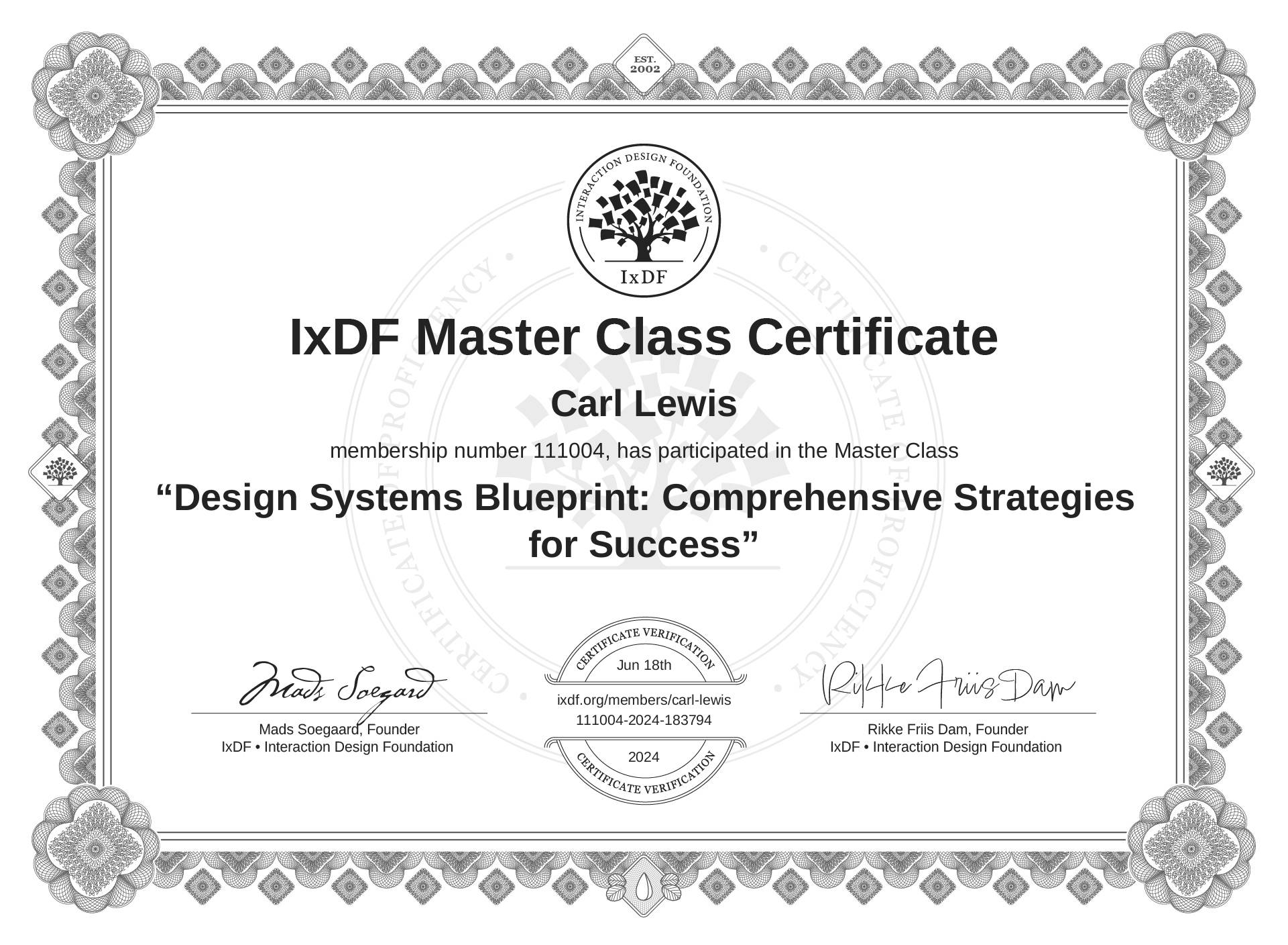 The IxDF Master Class Certificate (ID #mcc_58124827161e4f269f84a25be3bee8df) above is awarded to Carl Lewis in formal recognition of their participation in the Master Class Design Systems Blueprint: Comprehensive Strategies for Success .