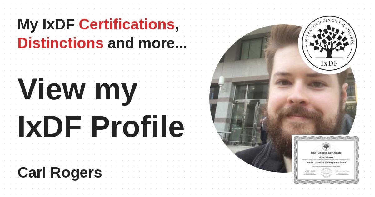 IxDF Course Certificates are awarded to Carl Rogers in formal recognition of their coursework surpassing the rigorous benchmarks of exceptional performance established by the IxDF Educational Codex.