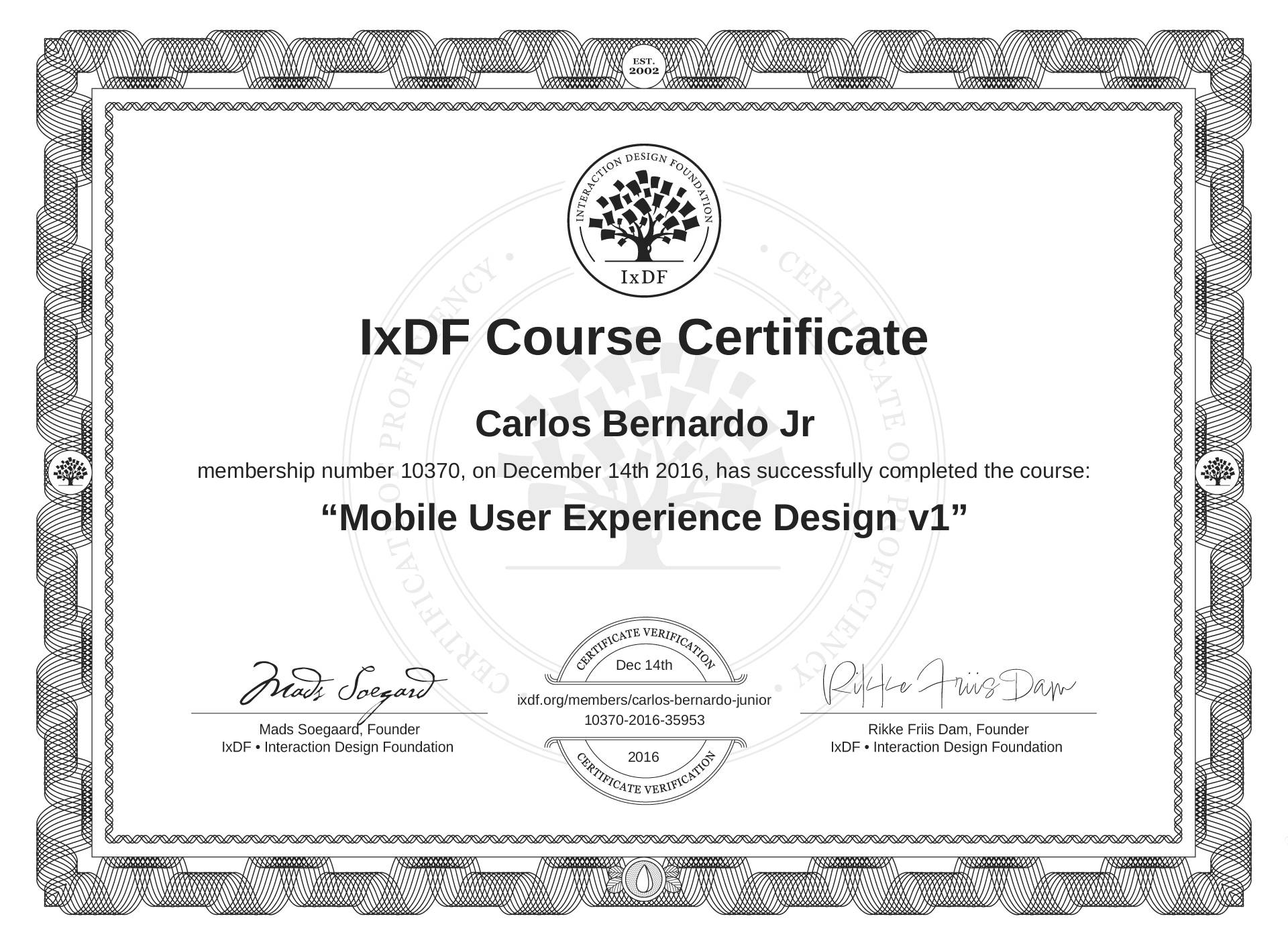 The IxDF Course Certificate (ID #MLHFqrQZP) above is awarded to Carlos Bernardo Jr in formal recognition of their coursework surpassing the rigorous benchmarks of exceptional performance established by the IxDF Educational Codex. View Course Curriculum.