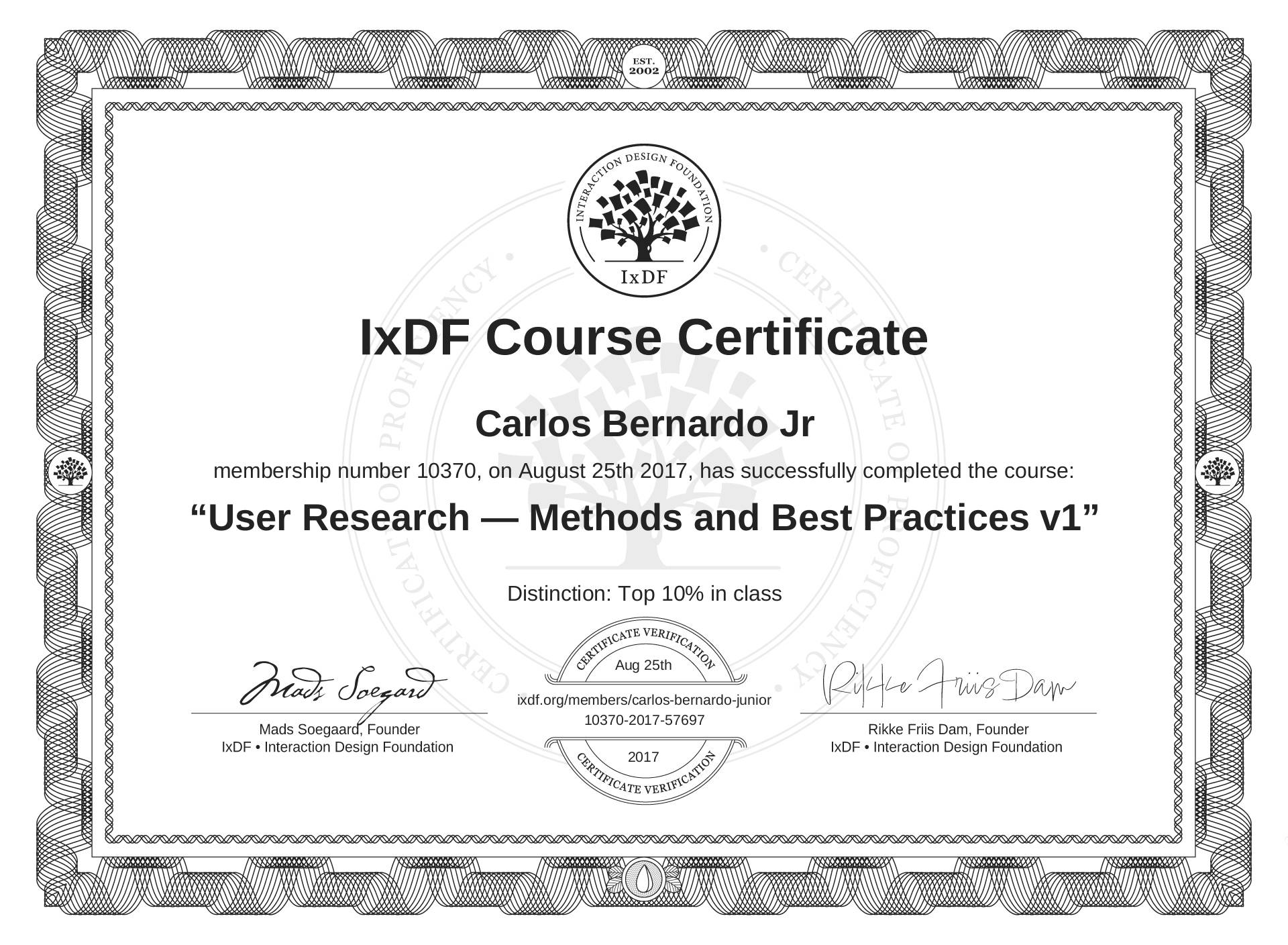 The IxDF Course Certificate (ID #Nl9dh2nC7) above is awarded to Carlos Bernardo Jr with a Top 10% Distinction in formal recognition of their coursework surpassing the rigorous benchmarks of exceptional performance established by the IxDF Educational Codex. View Course Curriculum.