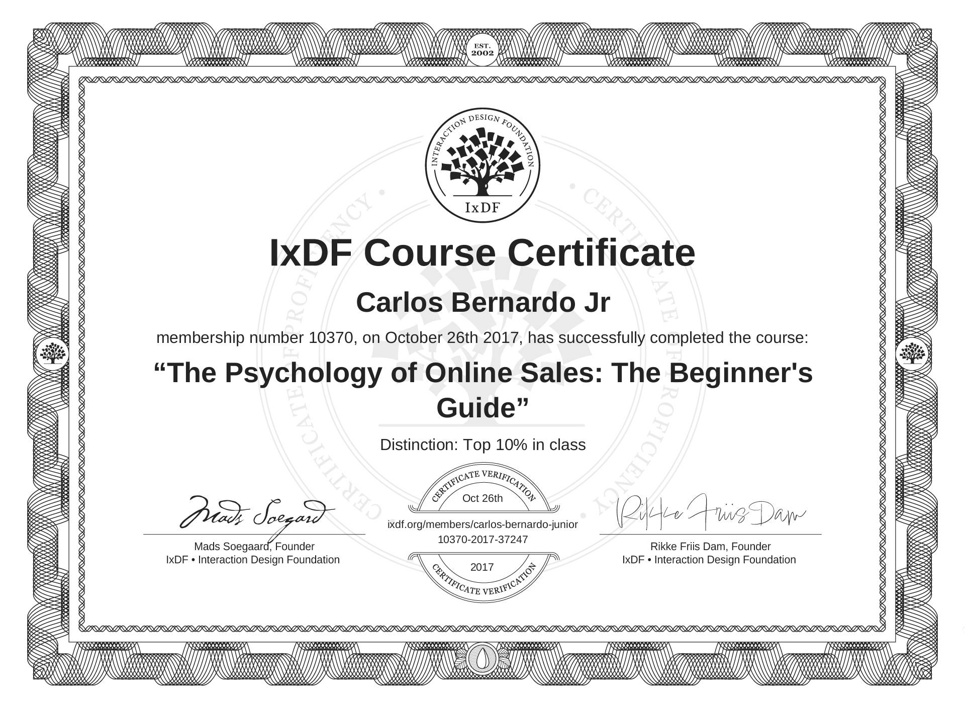 IxDF Course Certificate awarded to Carlos Bernardo Jr for completing the "The Psychology of Online Sales: The Beginner's Guide" course