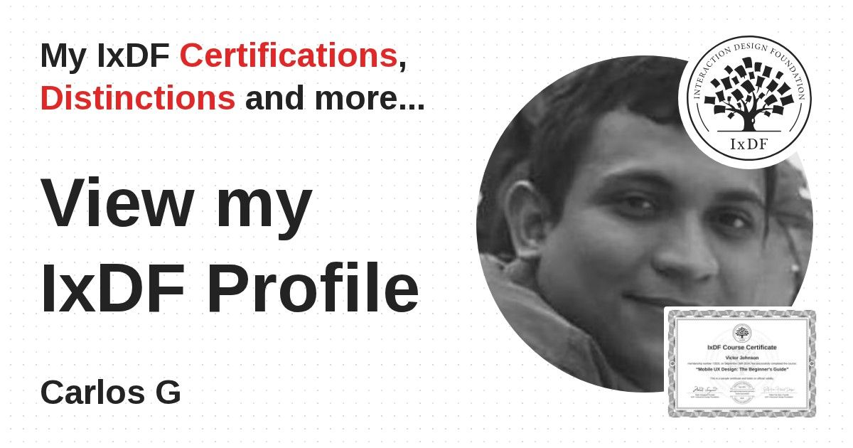 IxDF Course Certificates are awarded to Carlos G in formal recognition of their coursework surpassing the rigorous benchmarks of exceptional performance established by the IxDF Educational Codex.
