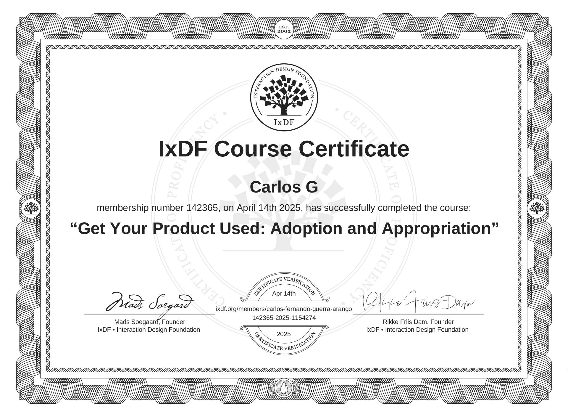 The IxDF Course Certificate (ID #fdb5c394-062a-4664-98d4-334bb31f61bf) above is awarded to Carlos G