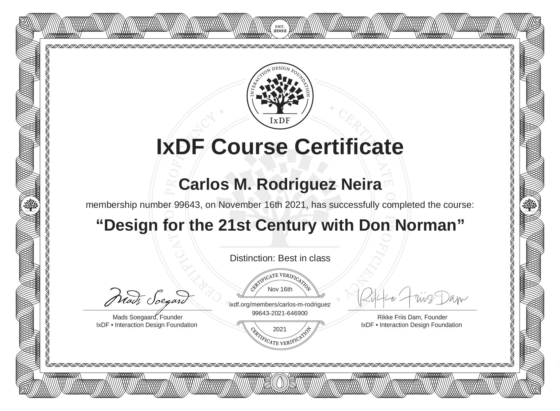 This IxDF Membership Certificate is issued to Carlos M. Rodriguez Neira