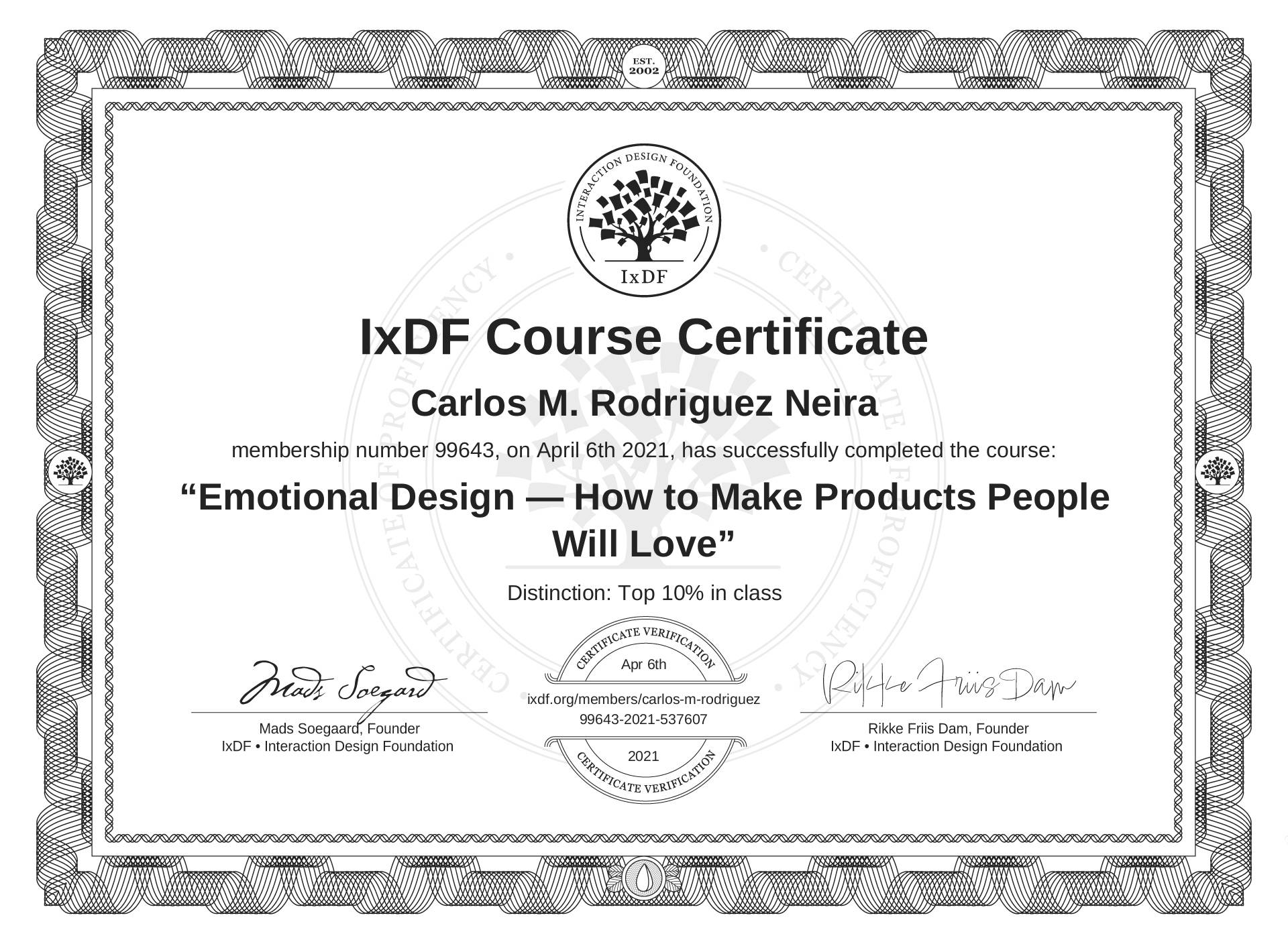 IxDF Course Certificate awarded to Carlos M. Rodriguez Neira for completing the "Emotional Design — How to Make Products People Will Love" course