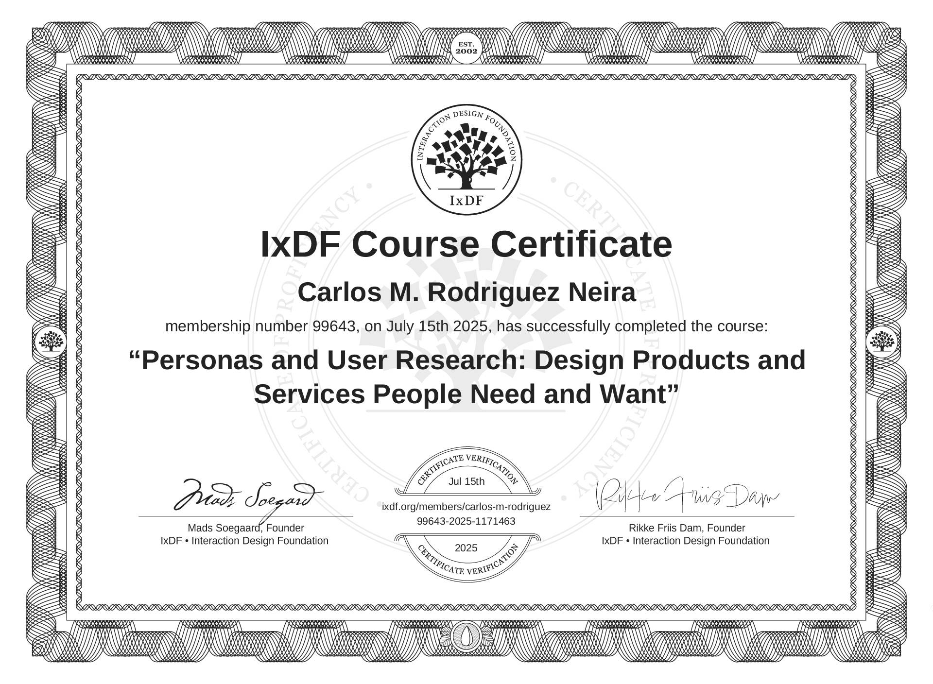 The IxDF Course Certificate (ID #c98ae375-5265-476f-8ff5-dd83ad874fa7) above is awarded to Carlos M. Rodriguez Neira in formal recognition of their coursework surpassing the rigorous benchmarks of exceptional performance established by the IxDF Educational Codex. View Course Curriculum.