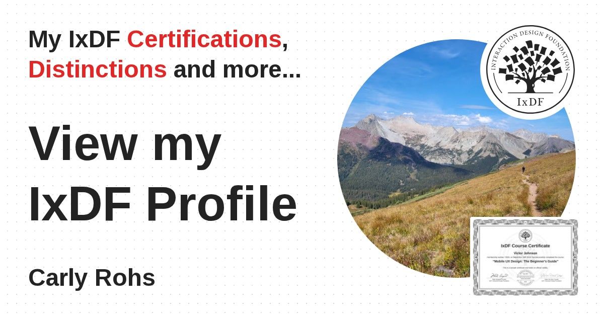 IxDF Course Certificates are awarded to Carly Rohs in formal recognition of their coursework surpassing the rigorous benchmarks of exceptional performance established by the IxDF Educational Codex.