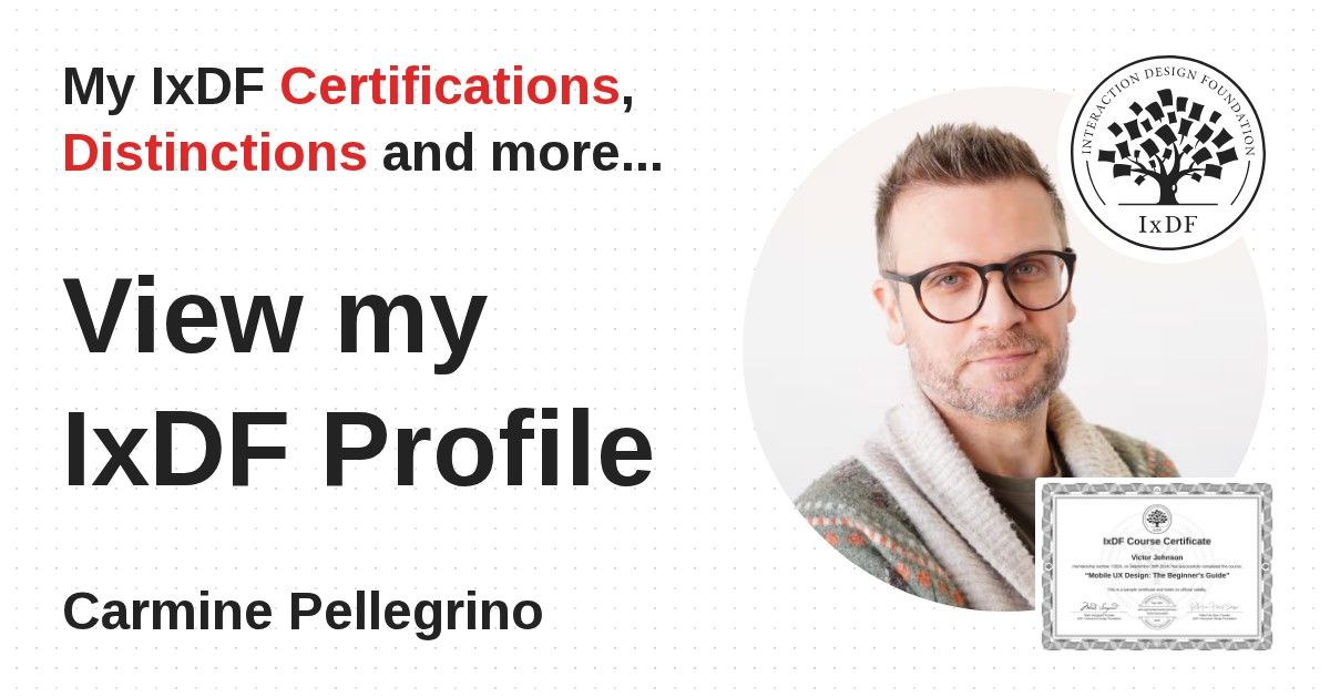 IxDF Course Certificates are awarded to Carmine Pellegrino in formal recognition of their coursework surpassing the rigorous benchmarks of exceptional performance established by the IxDF Educational Codex.