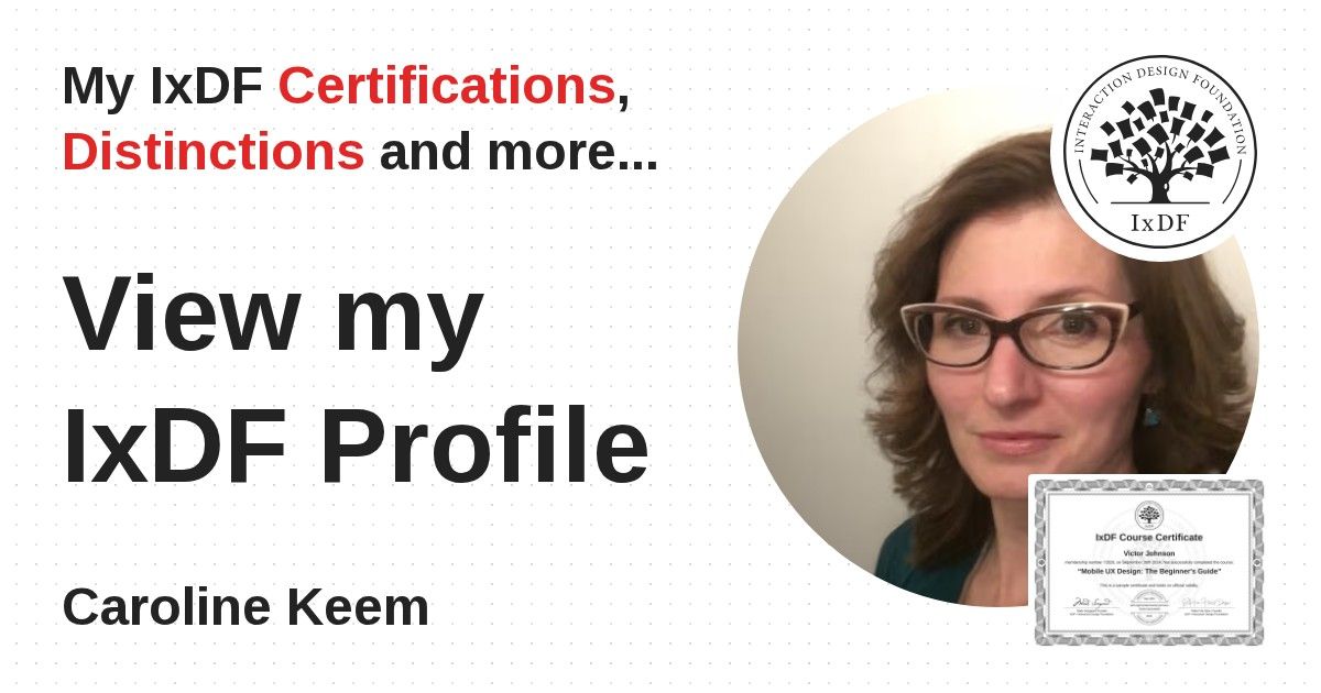 IxDF Course Certificates are awarded to Caroline Keem in formal recognition of their coursework surpassing the rigorous benchmarks of exceptional performance established by the IxDF Educational Codex.