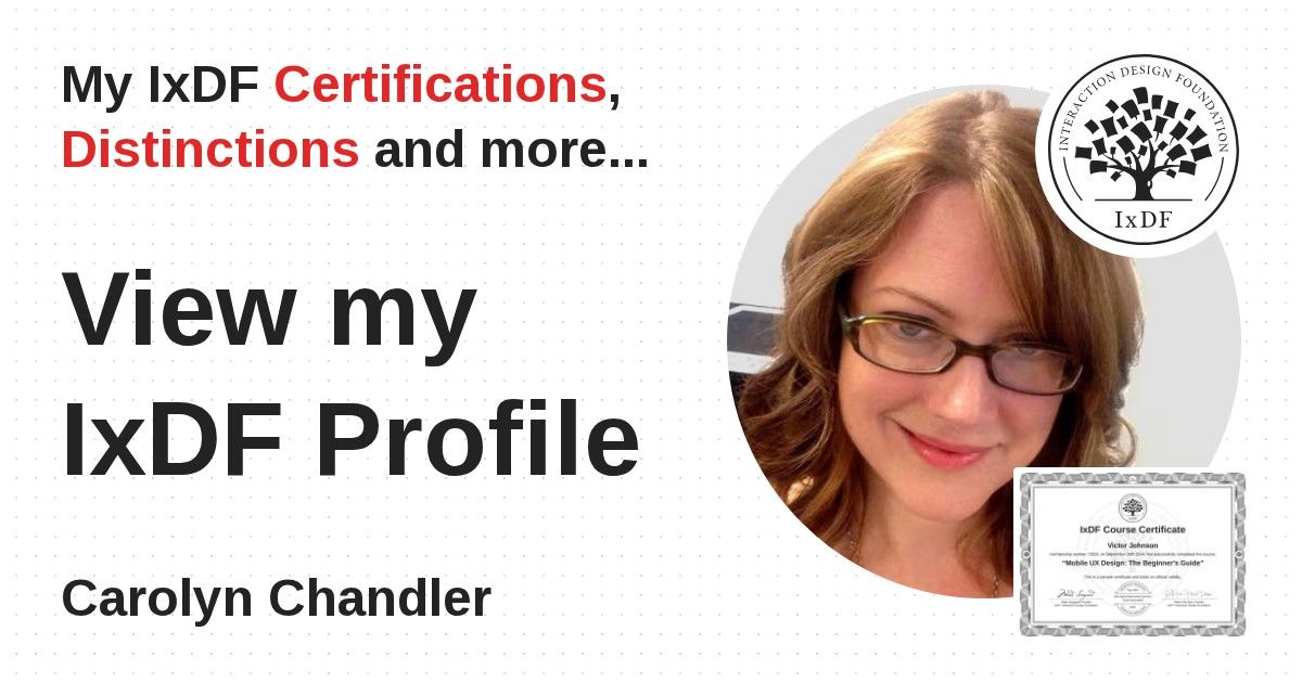 IxDF Course Certificates are awarded to Carolyn Chandler in formal recognition of their coursework surpassing the rigorous benchmarks of exceptional performance established by the IxDF Educational Codex.