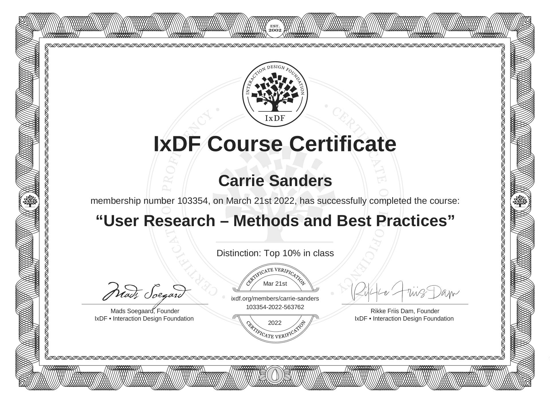 The IxDF Course Certificate (ID #333a23d0-8032-40bd-bb3a-b62f76fa8913) above is awarded to Carrie Sanders