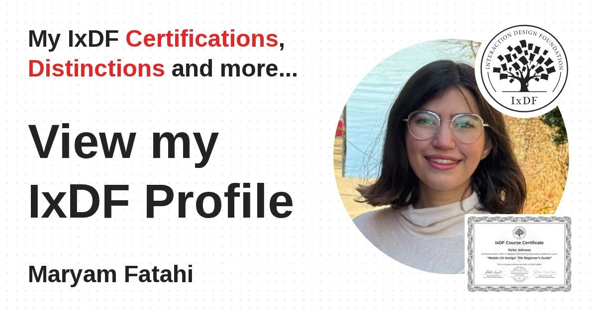 IxDF Course Certificates are awarded to Maryam Fatahi in formal recognition of their coursework surpassing the rigorous benchmarks of exceptional performance established by the IxDF Educational Codex.