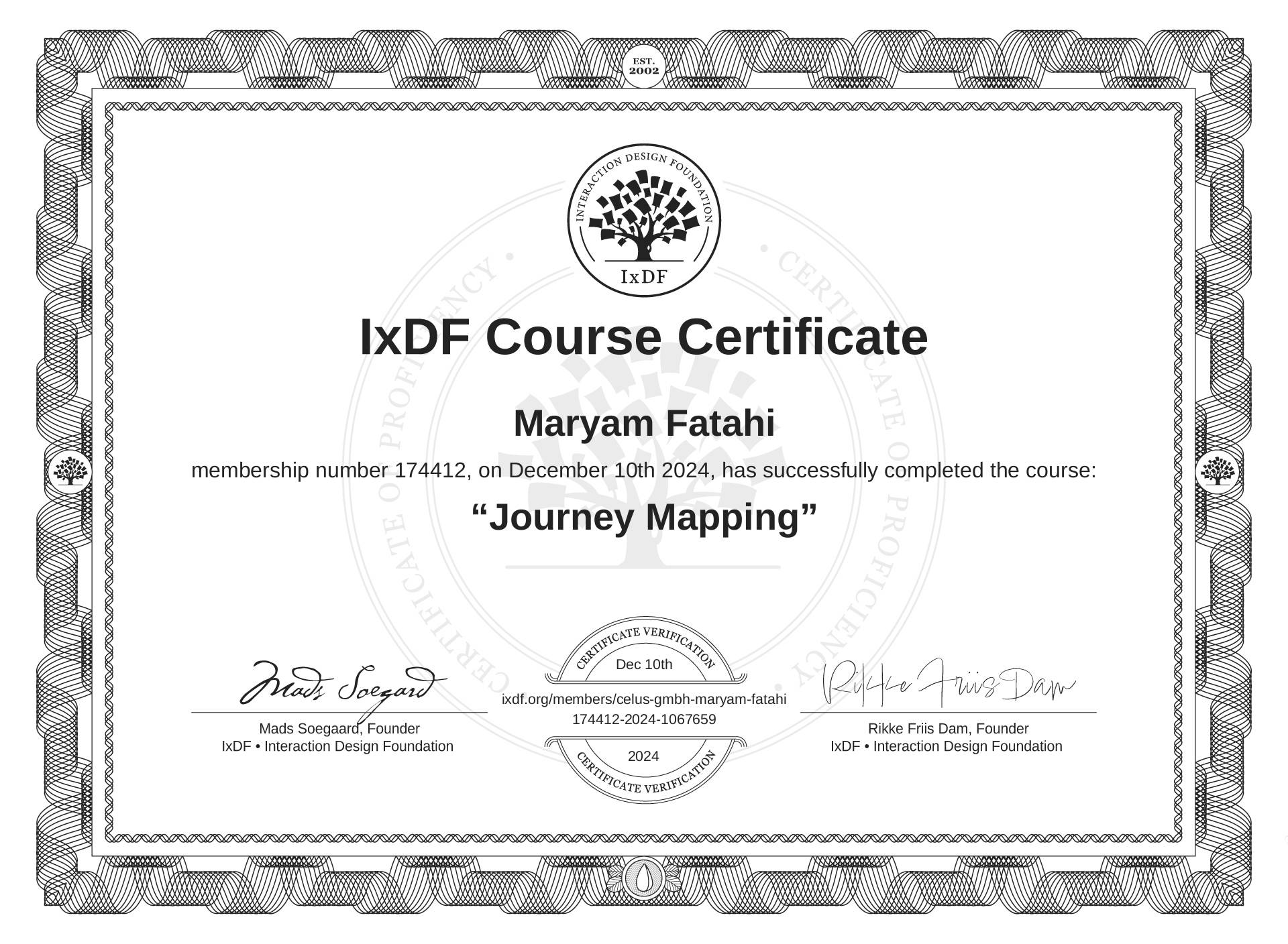 IxDF Course Certificates are awarded to Maryam Fatahi in formal recognition of their coursework surpassing the rigorous benchmarks of exceptional performance established by the IxDF Educational Codex.